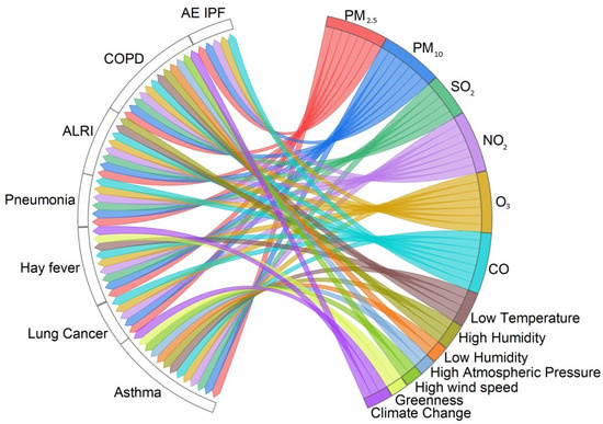 Figure 3 depicts a chord diagram showing positive associations between environmental factors (air pollution, weather conditions, greenness, and climate change) and respiratory health issues (asthma, lung cancer, hay fever, pneumonia, ALRI, COPD, and AE-IPF). The correlating chord diagrams presented in this scoping review were generated using the Origin Pro software. Each link in the chord diagrams shows a positive value association between the disease and the environmental factor as identified by reviewed articles. Also, in the case of the interplay of environmental factors with each other, links in the chord diagram show positive association values. It is important to note that the links in the chord diagrams show a positive association and are not quantified.
