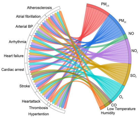 In Figure 4, we show positive associations between environmental factors, including air pollution and temperature, with certain CVDs (atherosclerosis, atrial fibrillation, arrhythmia, cardiac arrest, heart failure, stroke, heart attack, and hypertension) using a chord diagram.