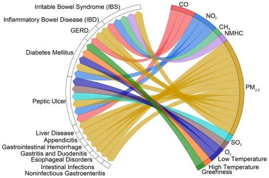 Figure 5 depicts the associations between certain metabolic and gastrointestinal health issues (IBS, peptic ulcer, noninfectious gastroenteritis, gastrointestinal hemorrhage, liver disease, appendicitis, gastritis or duodenitis, diabetes mellitus, IBD, gastroesophageal reflux disease (GERD), esophageal disorders, and intestinal infections) and air pollution, temperature, and greenness.