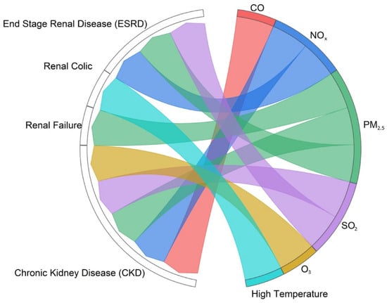 Depicts positive associations between renal and urogenital health issues and environmental factors (PM2.5: particulate matter smaller than 2.5 µg/m3, SO2: sulfur dioxide, NOx: nitrogen oxides, O3: ozone, CO: carbon monoxide).