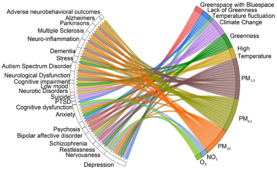 The chord diagram (Figure 7) illustrates the associations found between neurological and psychological health issues (anxiety, depression, nervousness, restlessness, suicide, schizophrenia, bipolar affective disorder, psychosis, PTSD, cognitive dysfunction, low mood, neuro-inflammation, neurotic disorder, stress, cognitive impairment, Alzheimer’s, Parkinson’s, Multiple Sclerosis, dementia, autism spectrum disorder, and adverse neurobehavioral outcomes) and air pollution, climate change, greenness, and weather conditions.