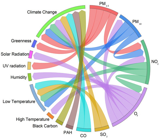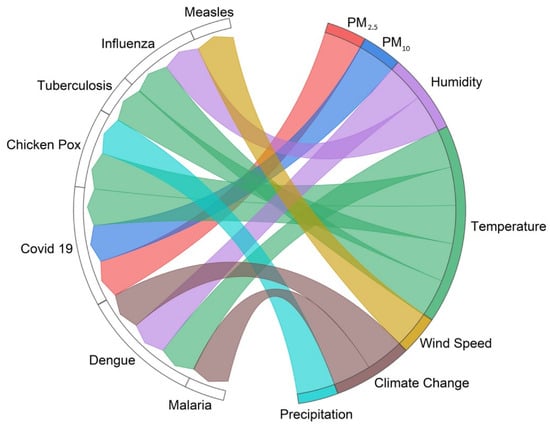 Kai et al. found that exposure to low temperatures is associated with an acute increased risk of tuberculosis hospitalizations and the association between temperature and tuberculosis admission varies depending on air pollution, latitude, and medical resources [106]. We have shown the associations between certain infectious diseases (malaria, dengue, measles, chicken pox, COVID-19, tuberculosis) and air pollution, climate change, weather conditions, and greenness using a chord diagram (Figure 8).