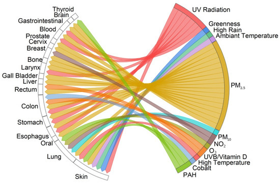 The chord diagram (Figure 9) shows associations between air pollution, solar radiation, greenness, and weather conditions and certain types of cancers (skin, lung, oral, esophagus stomach, colon, rectal, liver, gall bladder, larynx, bone, breast, cervix, prostate, blood, gastrointestinal, and brain). These associations were drawn from studies that identified a positive correlation between environmental factors and the cancer type.
