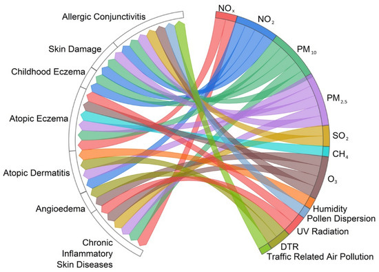 Several environmental stressors target the skin at its interface with the air. Angioedema is the swelling of the deeper layers of the skin and is caused by a buildup of fluid. It is frequently the result of an allergic reaction and can lead to potentially fatal complications. According to Kedarisetty et al., higher levels of air pollution, specifically ground-level O3, are associated with significantly higher rates of angioedema episodes [120]. This could be due to lower levels of air pollution around the greenspace, increased physical activity in the greenspace, or decreased adiposity. Patella et al. showed that weather variations and air pollution have a substantial impact on the symptoms and skin responsiveness of atopic dermatitis (AD) patients, worsening their dermatitis. AD was also found to be associated with DTR 14 °C, relative humidity, PM10, and NO2 [121]. Wang et al. found associations between hydrocarbons such as CH4 and atopic dermatitis, also named atopic eczema [32]. Moreover, Anke Huls et al. found that exposure to certain air pollutants, such as NOx, PM2.5, and PM10 is associated with an increased risk of eczema, particularly non-atopic eczema [122].