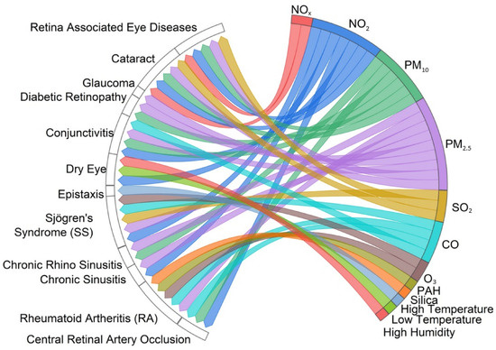The chord diagram (Figure 11) shows associations between air pollution and weather conditions with certain diseases related to rheumatology, otolaryngology, and ophthalmology (Sjögren’s Syndrome, rheumatoid arthritis, chronic sinusitis, chronic rhino sinusitis, dry eye, epistaxis, glaucoma, diabetic neuropathy, central retinal artery occlusion, cataract, retina associated chronic eye diseases, and conjunctivitis).