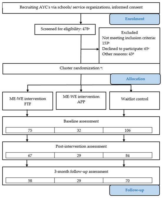 The evaluation of the intervention employed a robust mixed-methods triangulation design [16], where the quantitative survey questionnaire was complemented with open-ended questions aimed at gathering AYCs’ impressions of intervention activities and the intervention itself, especially after employing COVID-19 social distancing, as well as limitations in implementing the intervention. The quantitative survey questionnaire was filled in by participants in the training sessions (ME-WE intervention and waitlist control group). Instruments were used that measured outcomes at the individual level. Data were collected at three moments: First, at baseline (T0). The second measurement (T1) was conducted after the last training session for the ME-WE intervention group. Data for the control group were collected 7 weeks after T0 for the waitlist control group. The third, and last, measurement (T2) was conducted at 3 months after T1 for both the ME-WE intervention and the control group. After filling in the third survey, participants in the control group were invited to participate in the training program that was previously offered to the intervention group. The Consolidated Standard of Reporting Trials (CONSORT) 2010 statement extended to cluster trials is followed in this study. The research flow diagram is presented in Figure 1.