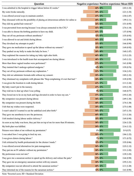 The prevalence of mistreatment during childbirth varies significantly between countries. A study conducted in four African and Asian countries identified obstetric abuse in over 40% of the observed births and over 35% of the surveyed women []. In contrast, a study conducted in six European countries estimated that, on average, one in five women experience abusive healthcare during pregnancy []. Given the divergence across countries, the WHO recommends researching non-compliance with proper obstetric practises in various contexts to better understand its implications for women’s experiences and decision-making []. To enhance data management, the variables have been categorized into the following four groups: (i) factors impacting the labour experience; (ii) factors influencing the experience of vaginal birth; (iii) factors affecting the experience of caesarean section; and (iv) emotional experiences during labour and birth.