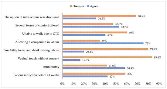 Regarding the participants’ responses on whether their preferences were honoured and if the birth plan was respected, the findings indicate that 41.6% and 59.3% of the women, respectively, reported that their wishes were not fulfilled. There is a lack of widespread respect for women’s preferences. Providing respectful care aligns with a human rights-based approach, which has the potential to enhance women’s experience during labour and childbirth and address health disparities. Additionally, it contributes to reducing maternal morbidity and mortality [].