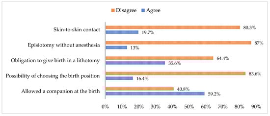 The following variables were categorized together as factors influencing the childbirth experience: the opportunity to have a support person present during birth, the ability to select a birthing position, the requirement to assume a gynecological position during delivery, the administration of episiotomy without anesthesia, and the facilitation of skin-to-skin contact. Figure 3 presents these grouped variables, and the percentage of concurrence or discordance expressed by participants in response to the survey questions.