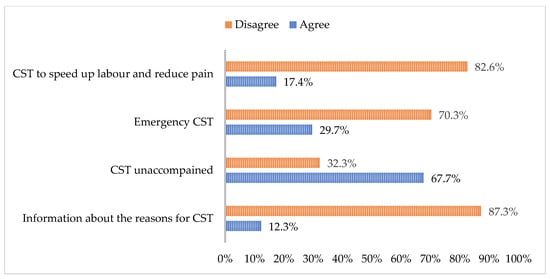 The data presented in Figure 4 indicate that 87.3% of the women surveyed reported being informed about the clinical reasons for doctors recommending a caesarean section. However, 12.7% of respondents acknowledged not receiving this information. The prevalent perceived justifications for caesarean sections, as reported by the women, include emergencies (70.3%), and the procedure is utilized to expedite birth and alleviate pain (82.6%). Despite this prevalent perception, it is essential to note that the National Institute for Health and Care Excellence (NICE) recommends that women be empowered with information and be involved in decision-making. Notably, the NICE’s 2021 guide, updated in 2024, does not endorse expediting birth and pain management as valid justifications for a caesarean section [].