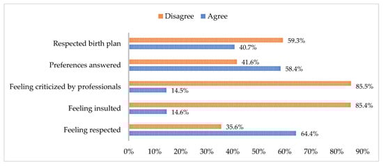 Several variables were combined regarding the emotional experience during labour and birth, including feeling respected, feeling insulted, feeling criticized by professionals, having preferences met, and having the birth plan respected. Figure 5 illustrates the grouping of these variables along with the percentage of agreement or disagreement among the participants in response to the questions they were asked.
