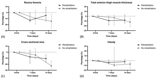 Table 4 and Figure 1 show the percentage changes in muscle mass parameters over time for all patients categorized by rehabilitation status. At 7 days, there were no significant differences between the rehabilitation and no rehabilitation groups in rectus femoris thickness, total anterior thigh muscle thickness, or rectus femoris cross-sectional area. At 14 days, the rehabilitation group had significantly less reduction in the rectus femoris cross-sectional area (−4.6% (−10.9–6.1)) compared to the no rehabilitation group (−22.8 (−26.6–−14.9)) (p = 0.021). Other parameters, including echogenicity and in-body skeletal muscle mass, were not significantly different between the groups at either time point.