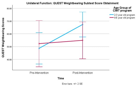 Levene’s test of Equality revealed no statistically significant variance between age groups of any of the QUEST variables. The mixed factorial ANOVA tests revealed no statistically significant main effects for the age group between the 2–3-year-old and 4–6-year-old programs. The mixed factorial ANOVA tests revealed a statistically significant main effect for time with four of the five QUEST variables displaying statistically significant improvements from pre- to post-intervention as seen in Table 3. Though the QUEST Grasps subtest total scores improved from pre- to post-intervention, the scores did not statistically significantly improve. The mixed factorial ANOVA tests indicated there was only one statistically significant interaction effect for age group vs. time occurring in the QUEST Weightbearing subtest, F(1, 35) = 4.3 and p = 0.045, as depicted in Figure 1. Children in the 2–3-year-old group displayed lower scores at pre-intervention (x = 48.64, SD = 30.7) compared to the 4–6-year-old group (x = 52.32, SD = 28.73); however, they accelerated at a higher rate by post-intervention (x = 67.31, SD = 21.78) than their 4–6-year-old counterparts (x = 54.91, SD = 28.46).
