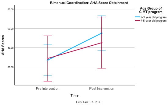 Levene’s test revealed no statistically significant variance between the age groups. The mixed factorial ANOVA test indicated no statistically significant main effect for the age group on the AHA. A statistically significant effect for time was detected as the entire sample displayed statistically significant improvements from pre- to post-intervention for the AHA scores, as depicted in Table 3. A statistically significant interaction effect occurred, F(1, 35) = 4.46 and p = 0.039. The children illustrated the same trend as with the QUEST Weightbearing subtest where the 2–3-year-old group displayed a lower pre-intervention score (x = 33.5, SD = 19.45) than the 4–6-year-old group (x = 34.36, SD = 19.74) but surpassed the 4–6-year-old group post-intervention score (x = 42.54, SD = 21.24) with a score of (x = 47.5, SD = 22.48). The pairwise comparisons revealed both age groups statistically significantly improved in bimanual coordination from pre-post intervention with both groups displaying differences at the adjusted p < 0.001 level. Figure 2 represents the AHA score obtainment for both age groups at pre- and post-intervention.