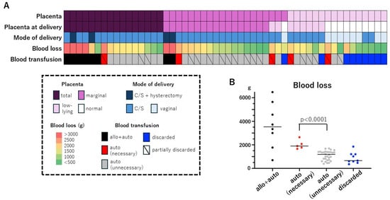 Figure 1. Outcome of 52 patients who underwent autologous blood donation for placental malposition. (A) Heat map presentation of individual cases. Placenta: position of placenta; total: total anterior placenta; marginal: marginal anterior placenta; low-lying: low-lying placenta. C/S: cesarean section; allo: allogeneic transfusion; auto: autologous transfusion; discarded: autologous blood was discarded. A shaded line in the box indicates that autologous blood was partially discarded. (B) Blood loss during delivery.