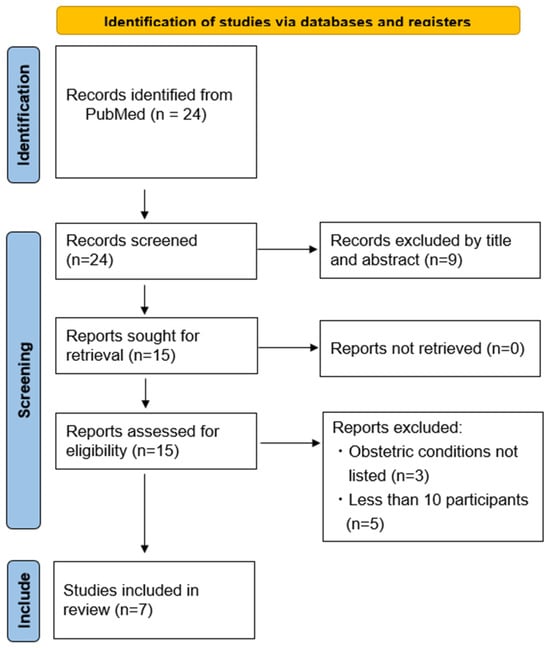 After applying the search method, 24 articles were identified, as described in the PRISMA flow diagram (Figure 2). A review of titles and abstracts was carried out, resulting in the selection of 15 articles for detailed full-text evaluation. Three articles that did not specify the patients’ obstetric condition and five articles with fewer than 10 participants were excluded. Seven articles that met the established inclusion criteria were selected for further evaluation in this systematic review. No randomized control study was found. A qualitative systematic review was conducted using observational studies.
