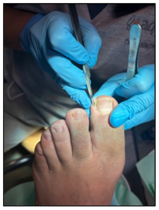 All participants underwent spiculotomy. The affected area was disinfected with chlorhexidine, a powerful and fast skin disinfectant [18,19,20]. The spicule was removed by cutting the segment of the nail plate embedded in the periungual fold. The procedure was conducted with pliers, Adson forceps, and a scalpel with a number 15 blade.