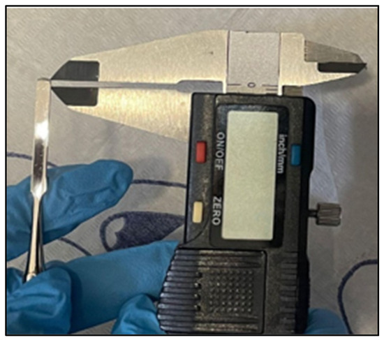 Regarding clinical measures, pain and inflammation were assessed. Pain was assessed with a visual analogue scale (VAS) in a smartphone app [21] where the patient was shown the VAS on a smartphone and with a pointer had to indicate his/her level of pain, where the labels of the end points on the left and right sides of the horizontal line indicated “no pain” and “worst possible pain”, respectively. The patient marked the level of intensity of the pain caused by his/her pathology on the screen of an electronic device, taking the average as a reference value. The inflammation of the lateral fold was assessed with a digital caliper and a straight metal spatula. The spatula was carefully introduced between the lateral fold and the nail plate (Figure 3). Then, the distance from the edge of the spatula to the lateral fold was accurately measured (Figure 4).