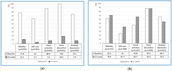 (a) Percentage changes in the intervention group reporting some or severe problems across the dimensions of EQ-5D-3L (n = 27). (b) Percentage changes in the control group reporting some or severe problems across the dimensions of EQ-5D-3L (n = 24).