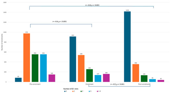 There were 391 enrolments that met the criteria. There was a significant reduction in ED visits among this group (r = −0.86, p < 0.001) during post-enrolment as compared to pre-enrolment (Supplementary Table S3). This reduction was already of a moderate effect during the enrolment period (r = −0.64, p < 0.001).