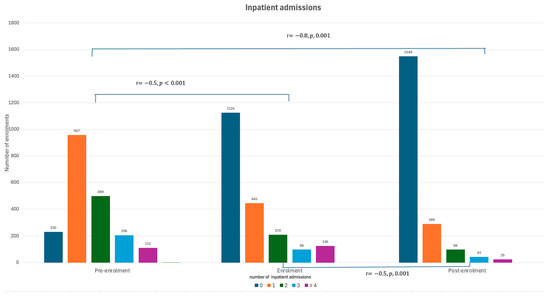 Similarly, a reduction of 38.7% in inpatient admissions (n = 2414) was observed during enrolment into a transitional care program (from n = 3080). Compared to the pre-enrolment period, there was a reduction of 76.2% (n = 983) in inpatient admissions post-enrolment. The number of patients that had no inpatient admissions increased while those who were admitted one, two, three, and four or more times decreased significantly during (r = −0.5, p < 0.001) and after the transitional care program (r = −0.8, p < 0.001) (Figure 2 and Supplementary Table S2).