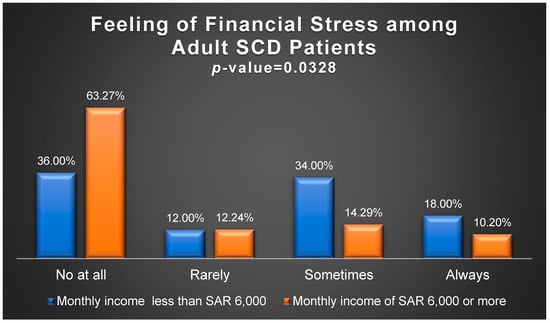The out-of-pocket expenditures (OOPEs) incurred by families with members affected by sickle cell disease (SCD) were substantial, representing between 24% and 41% of the monthly income for families earning less than SAR 10,000 ($2666.67), and accounted for 75% of the patients. Furthermore, the financial strain SCD patients and their caregivers felt was significantly higher among those earning less than SAR 6000 ($1600), who made up more than 50% of the patients. This presents a significant welfare issue, as reported in a study that examined the impact of health-related OOPEs among Saudi families using nationally representative data []. This finding aligns with other studies that reported noteworthy OOPEs among SCD patients in low- and high-income countries [,,].