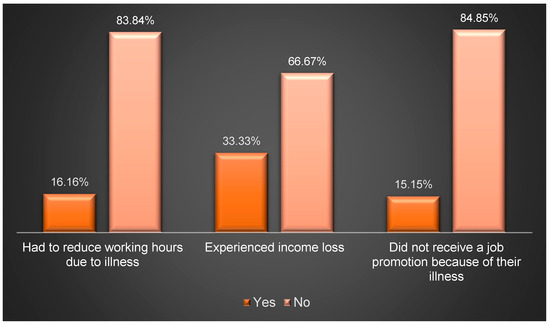 The mean monthly out-of-pocket expenses (OOPEs) for healthcare services, comprising medical visits, prescription drugs, lab tests, and imaging studies, amounted to USD 523.28, representing 80.42% of the total monthly OOPEs, as outlined in Table 2. Meanwhile, Figure 1 illustrates the range of OOPEs for travel and accommodation for patients outside Riyadh. Given that over 50% of the participants come from families with a monthly income of less than USD 1600, this figure served as a benchmark for comparing the proportions of participants experiencing financial stress. As indicated in Figure 2, nearly 63.27% of adult participants from families earning USD 1600 or more per month reported no financial stress due to SCD, compared to 36% of participants from families earning less than USD 1600 (p-value = 0.0328). Furthermore, 24.49% of participants from families earning USD 1600 or more per month felt financial pressure occasionally or regularly, in contrast to 52% among families earning less than USD 1600 (p-value = 0.0328). Additionally, Figure 3 depicts the impact of SCD on the careers of adult patients (≥18 yrs.). At least two-thirds of the adult participants had to reduce working hours, experienced income loss, or did not receive a job promotion due to their illness, as highlighted in Figure 3.