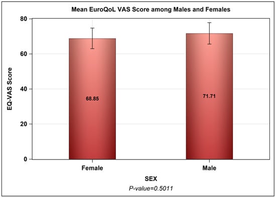 Mean scores of the EuroQol-5D-5L Visual Analog Scale (VAS) among male and female patients.
