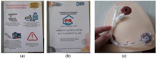 To create a realistic simulation and promote better understanding, the researchers used an anatomical piece of the abdominal region with an attached PEG tube, as well as a 60 mL syringe, gauze, and drinking water. Scientifically supported booklets created by the main research team (Figure 1) were also used to reinforce and illustrate the guidelines, and were later sent via messaging application for observation, reading, and discussion of any doubts.