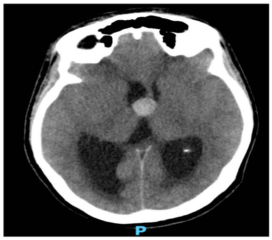 A nonenhanced CT image of the brain showing an oval dense lesion at the roof of third ventricle measuring 1.7 × 1.6 cm, obstructing the foramen of Monro.
