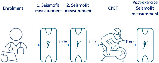 The study protocol. After enrolment two Seismofit® recordings were obtained with 5-min intervals before the CPEP test. A third Seismofit® recording was obtained 5 min after the CPET test.