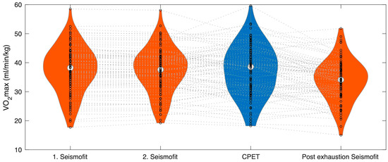 The first pre-exercise Seismofit® measurement yielded a value of 37.5 (8.1) mL/min/kg, and the second Seismofit® measurement yielded a value of 37.3 (7.8) mL/min/kg (see Table 1 and Figure 3). However, neither the first nor the second Seismofit® measurements showed a significant difference compared to the CPET VO2MAX at 37.2 (8.6) mL/min/kg (p = 0.64 and p = 0.96, respectively). The average of the two first Seismofit® measurements was 37.4 (8.0) mL/min/kg.