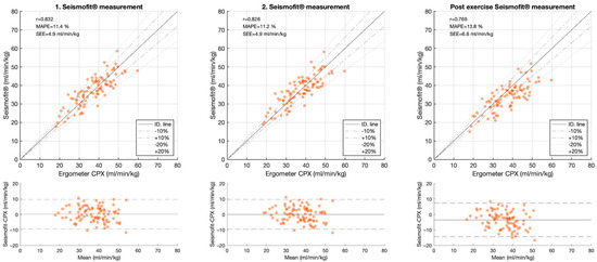The correlation between the CPET and the Seismofit® measurements was high; with r = 0.834 [0.76, 0.89] for the average estimate, r = 0.832 [0.76, 0.89] for the first measurement, r = 0.826 [0.75, 0.88] for the second measurement, and r = 0.769 [0.67, 0.84] for the post-exercise measurement, Table 2 and Figure 4. MAPE was 11.4% [9.74, 13] for the first estimate, 11.2% [9.59, 12.9] for the second estimate, and 13.8% [12, 15.6] for the post-exercise estimate. The limits of the agreement were −9.3 to 9.8 mL/kg/min in the first measurement and −9.3 to 9.8 mL/kg/min in the second measurement.