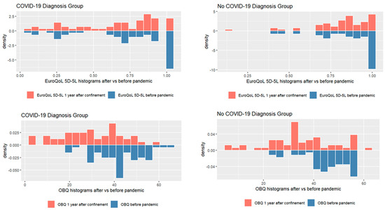 EuroQoL 5D-5L and OBQ histograms after vs. before the pandemic.