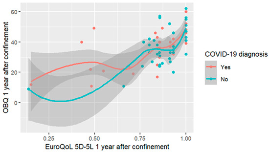 Moderate and significant correlations were found between OBQ and EQ-5D-5L scores in both samples. Figure 2 shows that higher OB was associated with better HRQoL 1 year after the social restrictions period in the COVID-19 diagnosis sample (r = 0.644, p < 0.01) vs. no COVID-19 diagnosis (r = 0.532, p < 0.001).