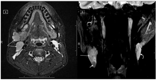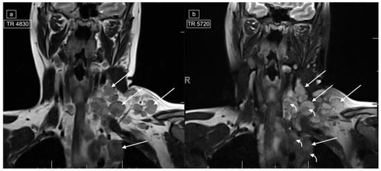 - King, A.D.; Lei, K.I.; Ahuja, A.T. MRI of neck nodes in non-Hodgkin’s lymphoma of the head and neck. Br. J. Radiol. 2004, 77, 111–115. [Google Scholar] [CrossRef] [PubMed]