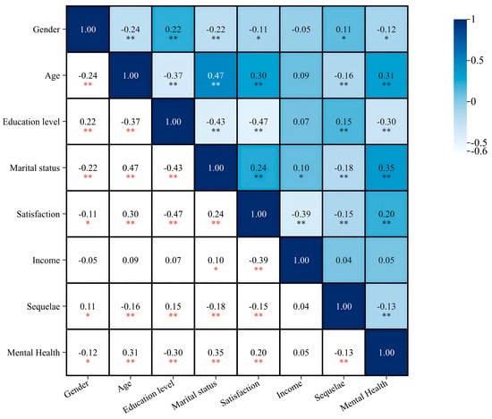 The correlation analysis showed that apart from income, other variables show a correlation with mental health. Age, satisfaction, and marital status were significantly and positively correlated with mental health (all p < 0.01), r = 0.31, 0.20, 0.35; gender was significantly and negatively correlated with mental health (p < 0.05), r = −0.12, whereas sequelae were significantly and negatively correlated with mental health (p < 0.01), r = −0.13 (Figure 1).