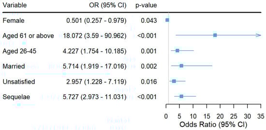 Forest plot showing binary logistic regression. Notes: Females (Ref: males), individuals aged 61 or above and 26–45 (both Ref: aged 18–25), married individuals (Ref: unmarried), unsatisfied individuals (Ref: satisfied), and those with sequelae (Ref: no sequelae) are presented. Values are shown as odds ratios (OR) with 95% confidence intervals (CI), and statistical significance is indicated by p-values, with p < 0.05 considered as the threshold for significance.