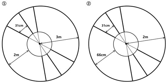 CG training was conducted according to previous studies, where a circular path with ladder-shaped steps was used to adjust the stride length [,]. The walking path consisted of a large circle (total length: 18.8 m, radius: 3 m, and curvature: 0.75 m) and a small circle (total length: 12.6 m, radius: 2 m, and curvature: 0.5 m), both created using 1.7 cm wide tape. Additional radii were drawn 31 cm apart along the outer third of the path to create the ladder shape. A concentric inner circle was created by connecting points in the inner third of the radii, with the distance from the inner circle being 2 m for the large circle and 66 cm for the small circle (Figure 2).