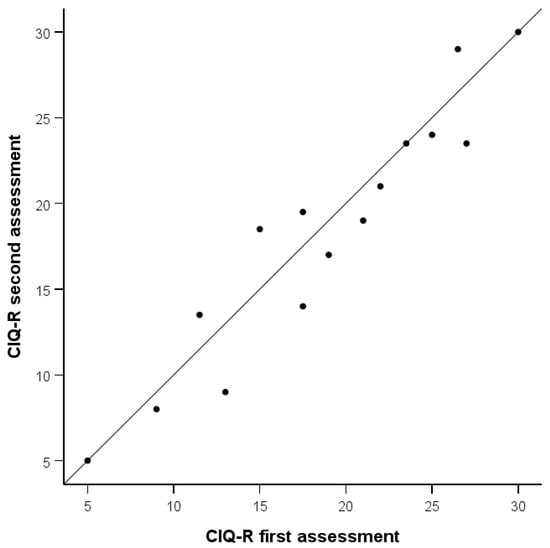 Total CIQ-R score upon first and second assessments (points on the diagonal indicate the same score upon both assessments).