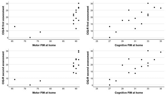 The comparison between the FIM and CIQ-R scores showed that only the FIM scores obtained at the time of the patients’ calls were statistically significantly associated with CIQ-R score (Table 3, FIM at home) and not FIM scores at the admission or discharge from the rehabilitation facility. The cognitive part of the FIM at home was clearly linearly related to the CIQ-R score (r = 0.78 and r = 0.83 with CIQ-R score obtained during the first and second assessments, respectively). The apparent association with the motor FIM was a consequence of the fact that three participants with low motor FIM scores (below 80) had very low overall CIQ-R scores (below 15 and below 10 during the first and second assessments, respectively), whereas the other participants had (almost) maximal motor FIM scores (89 to 91) while their CIQ-R scores varied widely (from 12 or 13 to 30 points; Figure 2).