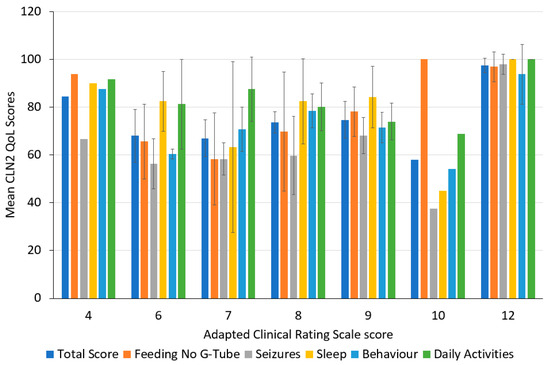Mean CLN2 Quality of Life (CLN2 QoL) scores grouped by Adapted Clinical Rating Scale score at baseline. Error bars represent standard deviations.