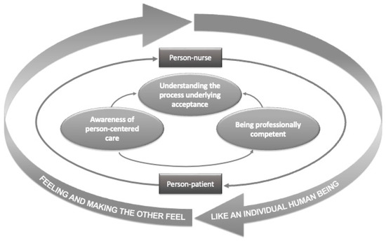 The data revealed that acceptance is not something that can be achieved spontaneously in the context of the nurse–patient relationship. Indeed, it is a unique process within each therapeutic relationship; i.e., each care encounter is unrepeatable as it arises in specific contexts where the personal and professional realities of the people involved in the therapeutic encounter are dynamic. Consequently, acceptance is explained as a living and changing process, characterized by its genuineness in the context of individualized care.