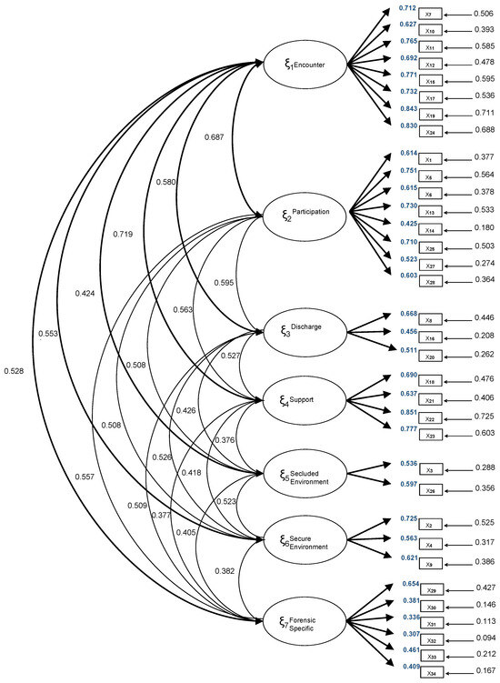 To verify the internal structure of the questionnaire, a confirmatory factor analysis (CFA) was employed, proposing a seven-dimensional model identical to the structure of the original version. Table 2 presents the model fit indices, and Figure 1 displays the factor loadings. Not all indices demonstrated a reasonable fit, and the majority of item loadings were equal to or greater than 0.50. Correlations between the subscales are shown in Figure 1. Additionally, the correlations between each subscale and the global instrument were determined, obtaining subscale–global correlation values for F1. Encounter (0.882), F2. Participation (0.871), F3. Discharge (0.747), F4. Support (0.754), F5. Secluded Environment (0.619), F6. Secure Environment (0.682), and F7. Forensic-Specific (0.718).