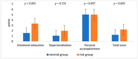 The comparison between the two ERI groups revealed higher values for “emotional exhaustion” and the total MBI score among the risk group (p < 0.05; Figure 1).