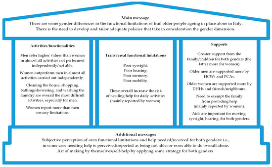 Background/Objectives Older people with functional limitations find it difficult to age in place alone, without cohabiting with relatives. In light of this, this paper aimed to investigate possible gender differences in this respect among seniors living in Italy. Methods: The study presents findings from the IN-AGE (“Inclusive ageing in place”) study carried out in 2019 in this country assessing the ability of seniors aged 65 years and over to carry out basic and instrumental activities of daily living (ADLs and IADLs), in addition to two mobility limitations (going up/down the stairs and bending to pick up an object) and sensory limitations (hearing and eyesight). Qualitative/semi-structured interviews were administered to 120 older people living in three Italian regions (Lombardy, Marche, and Calabria). Quantitative and qualitative analyses were performed by differentiating between genders and among activities carried out autonomously, with help, or not performed (i.e., the senior is “not able”). Possible sources of support were also explored. Results: The main results revealed that cleaning the house, shopping, bathing/showering, and washing the laundry are particularly difficult, with men reporting greater difficulties than women. Moreover, for both genders, the family—especially children—represents the main source of help, in addition to public and private services, but the results differ between males and females. Conclusions: These results can offer insights for policymakers in the development of adequate gender-sensitive policies.