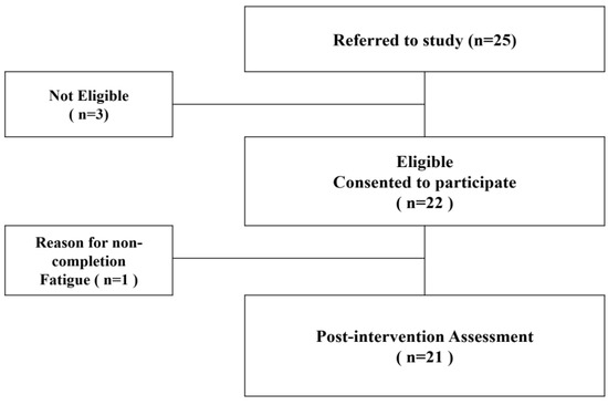 Of the 22 participants in the comprehensive exercise program, 21 attended at least 80% of the 20 intervention sessions, resulting in a participation rate of 95.5%. One participant withdrew after attending three sessions (6%) because of fatigue and travel distance. The exercise compliance rate was also high, with an average completion rate of 95.2%, indicating that all remaining participants completed at least 80% of their assigned exercise sessions (Figure 2).