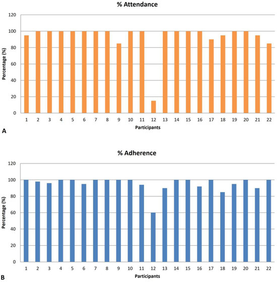 Feasibility of comprehensive exercise program in participants. (A) Attendance. (B) Adherence.