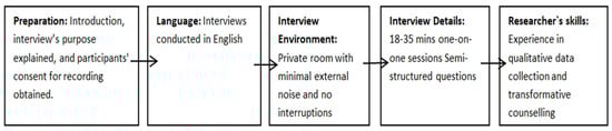 Upon the receipt of ethical approval, the researcher arranged a meeting with the provincial coordinator to describe the study and explain its aims, objectives, and significance, inclusive of any ethical issues. Furthermore, during this meeting, the researcher allowed questions from the provincial coordinator to clarify any misconceptions. The researcher requested the provincial coordinator to share the details of the study with potential participants to enable willing participants to express interest and share their contact details with the researcher. Thereafter, the researcher sent all willing participants an information sheet and consent form to peruse through. The date and time of the face-to-face interviews were agreed upon with prospective participants. The contact details of the researcher, supervisor, and co-supervisor were made available for the participants for the communication of any concerns or questions. Each step of the interview process, from initial preparations to final execution details, including the researcher’s skills and the steps taken to ensure data quality and confidentiality, is captured in the flow chart (Figure 1).