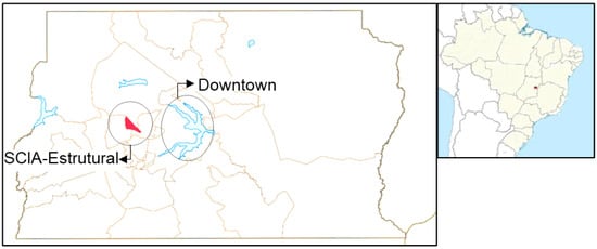 Study area: location of the primary healthcare unit in the Administrative Region of Cidade Estrutural (red) in the Federal District, Brazil. Downtown Brasília: the capital city of Brazil n: Source: https://pt.wikipedia.org/wiki/Distrito_Federal_%28Brasil%29, accessed on 15 August 2024.